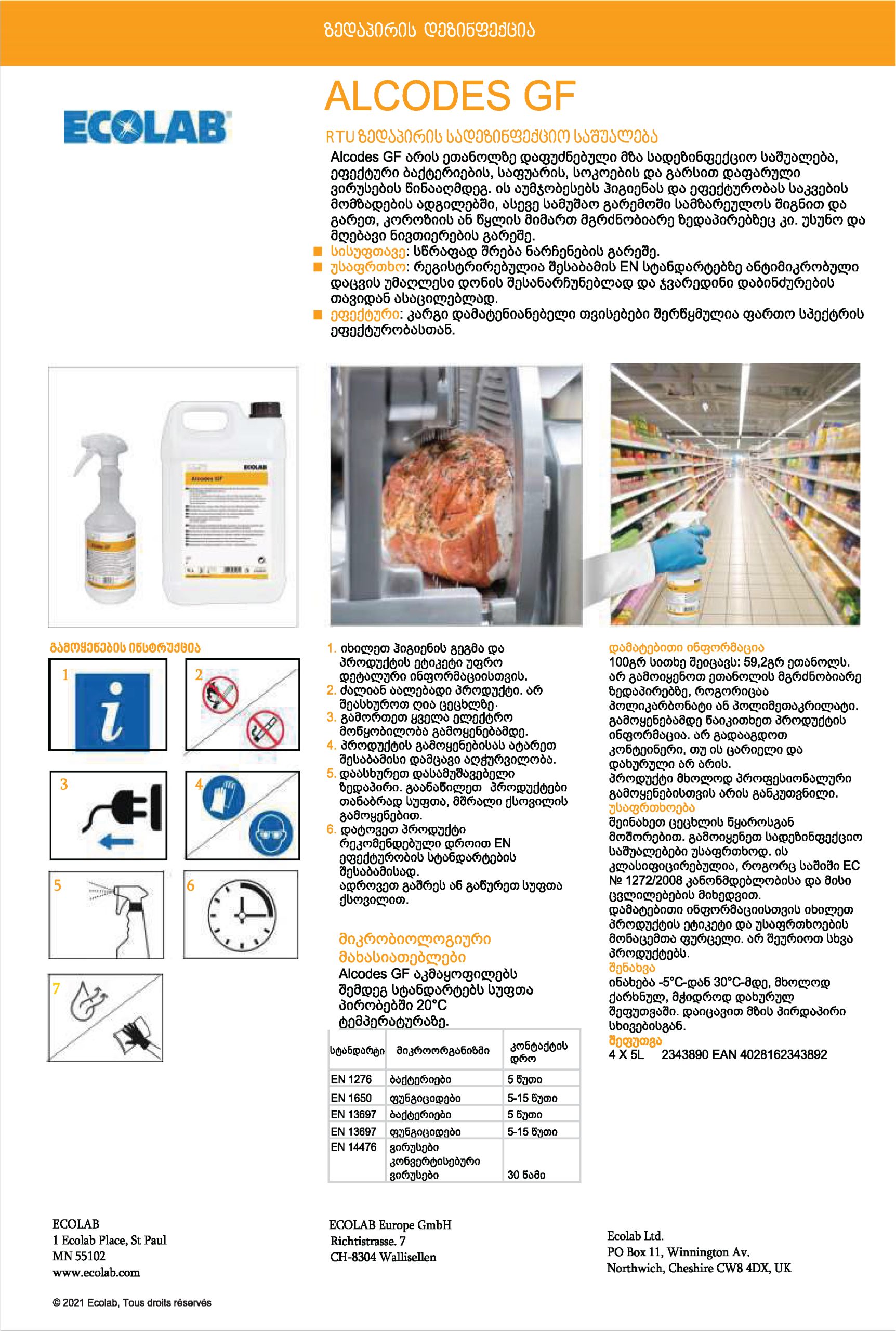 Alcodes GF არის ეთანოლზე დაფუძნებული მზა სადეზინფექციო საშუალება, ეფექტური ბაქტერიების, საფუარის, სოკოების და გარსით დაფარული ვირუსების წინააღმდეგ. ის აუმჯობესებს ჰიგიენას და ეფექტურობას საკვების მომზადების ადგილებში, ასევე სამუშაო გარემოში სამზარეულოს შიგნით და გარეთ, კოროზიის ან წყლის მიმართ მგრძნობიარე ზედაპირებზეც კი. უსუნო და მღებავი ნივთიერების გარეშე.