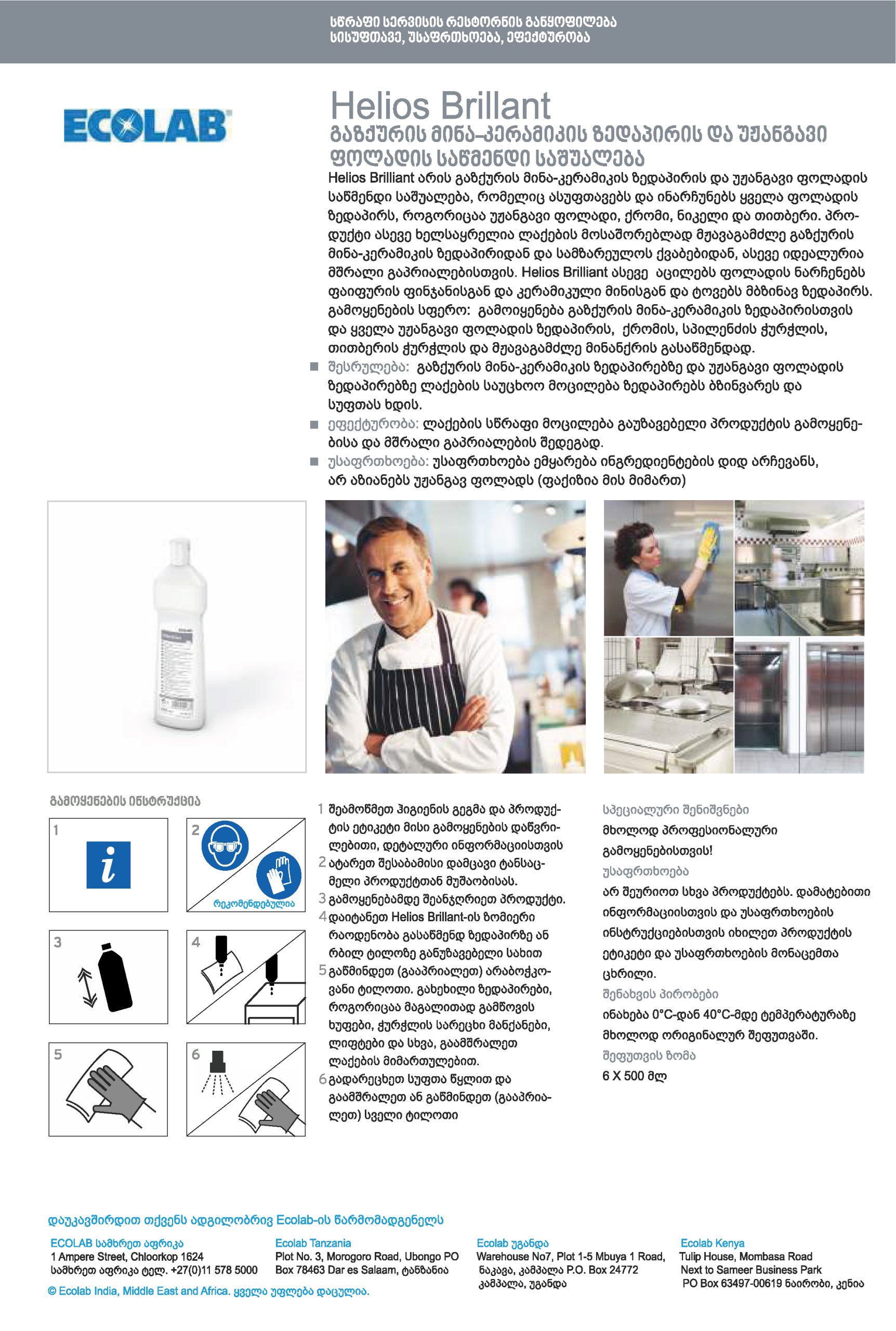 HELIOS BRILLANT არის გაზქურის მინა-კერამიკის ზედაპირის და უჟანგავი ფოლადის სამენდი საშუალება, რომელიც ასუფთავებს და ნარჩუნებს ყველა ფოლადის ზედაპირს, როგორიცაა უჟანგავი ფოლადი, ქრომი, ნიკელი და თითბერი. პროდუქტი ასევე ხელსაყრელია ლაქების მოსაშორებლად მჟავაგამძლე გაზქურის მინა-კერამიკის ზედაპირიდან და სამზარეულო ქვაბებიდან, ასევე იდეალურია მშრალი გაპრიალებისთვის.
